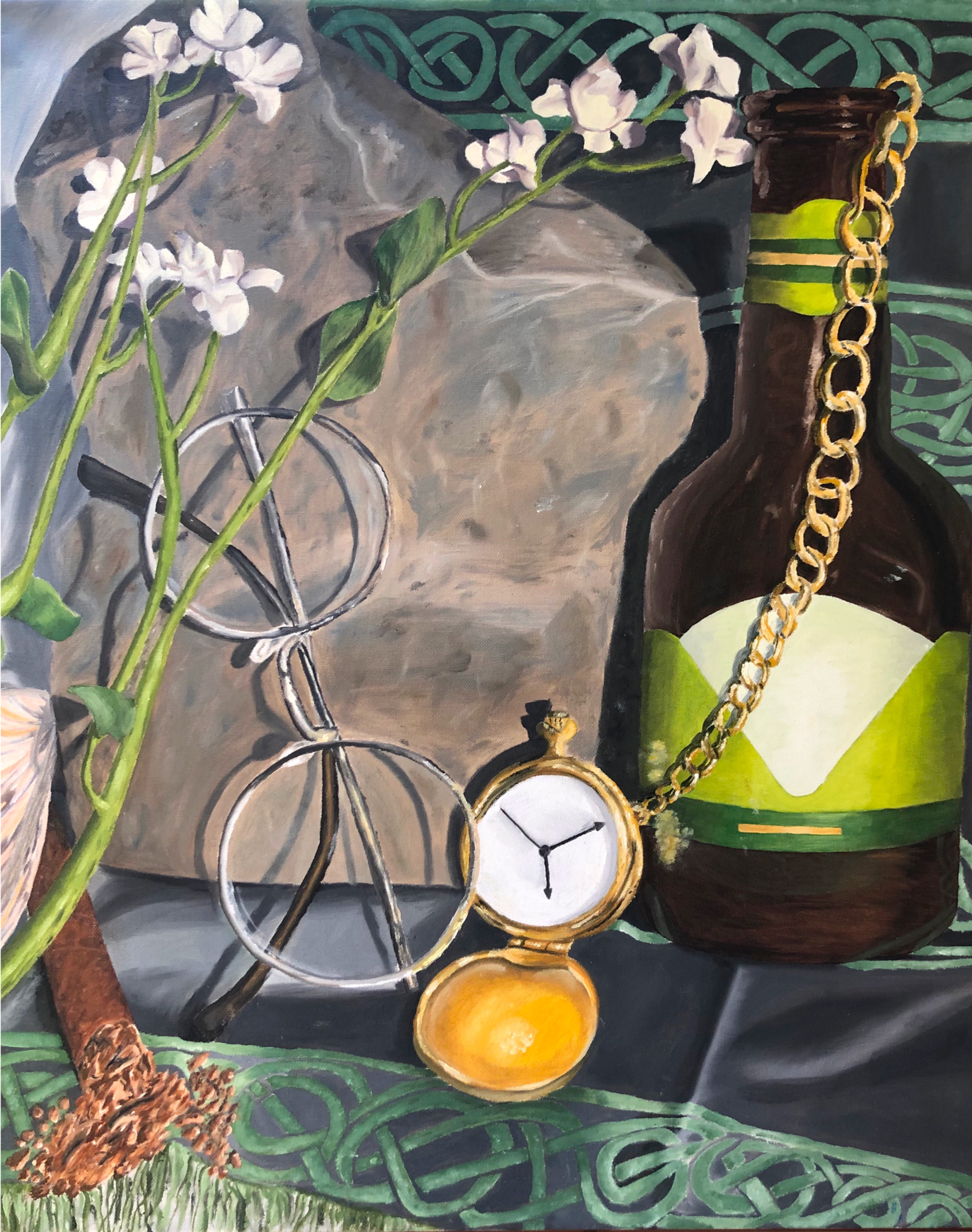 This piece was made at the peak of the 2020 pandemic in the midst of the first quarantine. I used only objects found in my bedroom to create the composition. The objects, their hazy rendering, and the color palette were meant as an expression of my mental state during these weeks. This state was characterized by its simultaneity. Even as time seemed to stand still and the situation was very grave, I found a great deal of growth and peace at this time of my life.